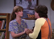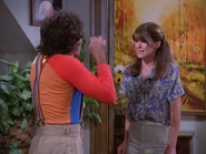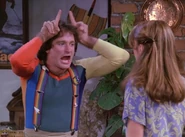 When there's a knock on the door in the apartment, both Mindy and Jeanie realize it must be Mork with Jeanie going to bat for Mork again having seen so contrite he was, asking Mindy to give him a chance. When they open the door, however, Mork hobbles in on a makeshift crutch, to which Jeanie gives him an eyerolling thumbs up and leaves them to it. Mindy goes to say she knows what's happened, but before she can actually get anything out, Mork launches into his Bickley inspired routine, claiming amnesia around the whole event, but she tells him she's not buying it, so he goes for the natural disaster route, unfortunately picking the onset of a tidal wave, before Mindy points out they're living in a city 1,000 miles away from the nearest ocean. Caught out on that he subsequently lays the blame on the full moon, and his being transformed into a WereMork pointing to his hairy arms. Having enough of his fantastical lies, Mindy calls him on it, feeling their friendship was built on honesty, and wanting to know if he doesn't feel bad for making up stupid stories. Sagging, he nods suggesting he should get a house in San Clemente, alongside Richard Nixon. Amused by that, she tells him to just tell her what he feels in his heart, and if he does she may accept and...maybe...then they can kiss and make up.
