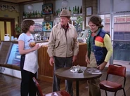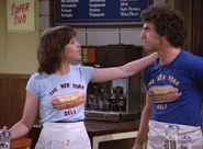Mork heads to lunch to The New York Delicatessen to meet Bickley but finds the cook and the waitress, Remo and Jeannie Da Vinci, having a ding dong verbal scrap, insulting each other. When Jeanie approaches Mork to take his order, he asks her about the fight and she explains that Remo forgot to lock up the night before, and it almost feels like he wants them to get robbed so they'll have to sell up and move back to the Bronx. When a chirpy Mr. Bickley arrives he orders his lunch to go. It transpires Bickley's been brining a new customer there every day since they opened, his good mood explained by the fact that he's getting his lunch for free in the process. When Mork tells them Remo & Jeannie are having a terrible fight, it just makes Bickley even happier getting 'a floor show', and when a confused Mork asks shouldn't fighting with someone you care about be considered a bad thing. Bickley tells him no, that it's a great way to keep things fresh and exciting, and reminisces happily over the huge fights he and his wife used to have.